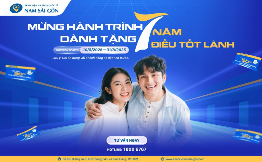 Nhân dịp kỷ niệm 7 năm thành lập (10/8/2018 – 10/8/2025), Bệnh viện Đa khoa Quốc tế Nam Sài Gòn trân trọng gửi đến Quý khách hàng chương trình ưu đãi đặc biệt, mang ý nghĩa như 7 điều tốt lành thay cho lời tri ân sâu sắc của bệnh viện dành cho sự tin tưởng của tất cả Quý khách hàng trong suốt thời gian qua.