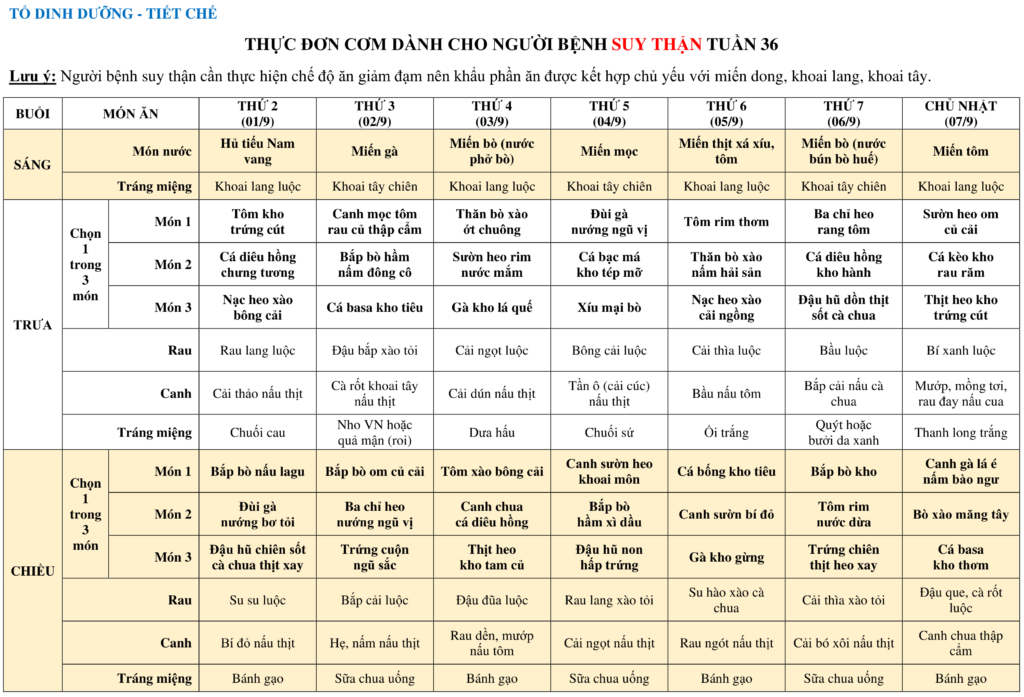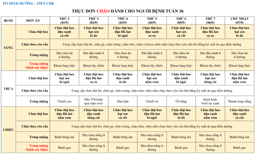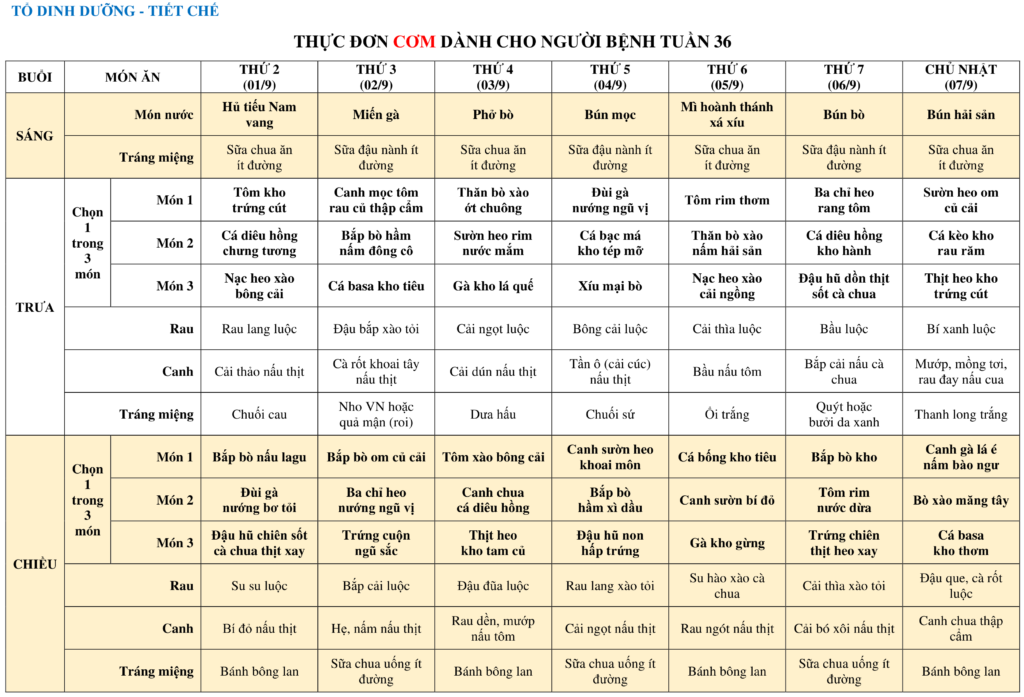 THỰC ĐƠN DÀNH CHO NGƯỜI BỆNH NỘI TRÚ TUẦN 36 (01/9-07/9)