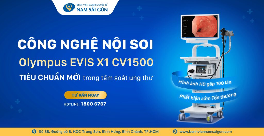 Bệnh viện Đa khoa Quốc tế Nam Sài Gòn trang bị hệ thống nội soi Olympus EVIS X1 CV1500 – công nghệ nội soi tiên tiến hàng đầu hiện nay, cho hình ảnh HD sắc nét, phóng đại gấp 100 lần, hỗ trợ phát hiện sớm các tổn thương nhỏ có nguy cơ tiến triển thành bệnh lý tiêu hóa nghiêm trọng. Công nghệ NBI tích hợp giúp tăng cường hiển thị niêm mạc và nhận diện tổn thương tiền ung thư.