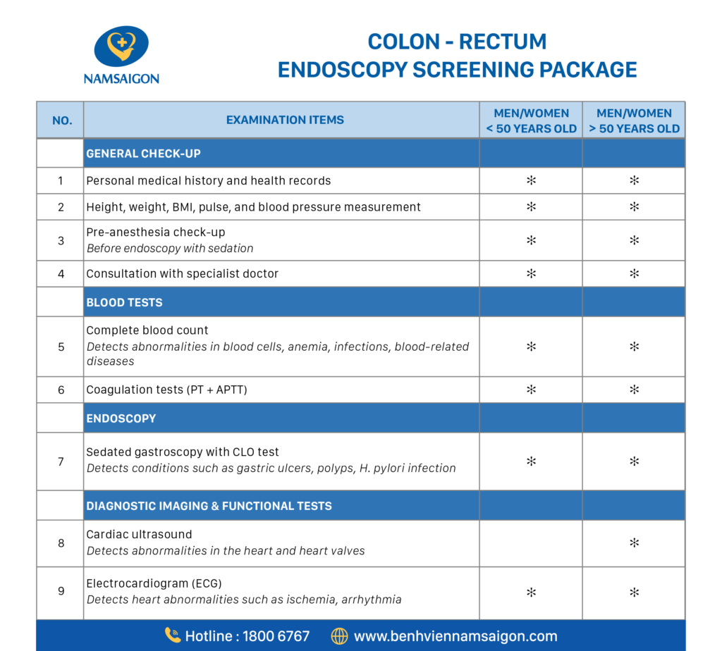 Currently, Nam Sai Gon International General Hospital does not accept Vietnam’s public health insurance for the colon — rectum endoscopy package. However, the hospital is partnered with 21 private insurance companies and offers direct billing services, subject to each customer’s policy benefits.