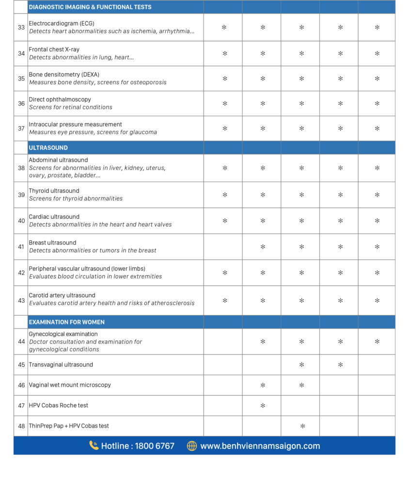 - Comprehensive cardiovascular and metabolic assessment: Includes echocardiography, electrocardiogram (ECG), blood lipid test, blood glucose test, liver and kidney function tests.