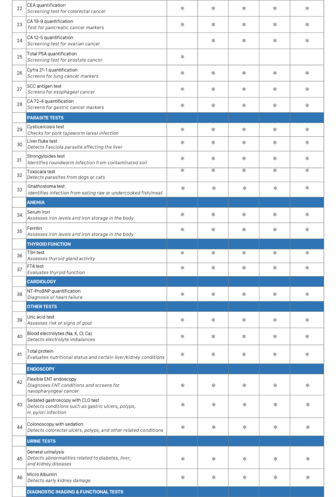• Tests for liver-kidney-thyroid function, cardiovascular system, parasites, hepatitis B/C…