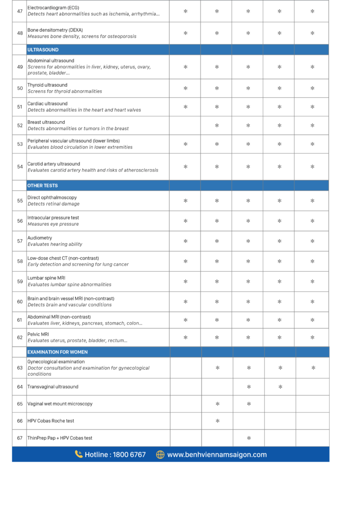 • Gynecological examination: Includes HPV testing and Pap smear exclusively for women.