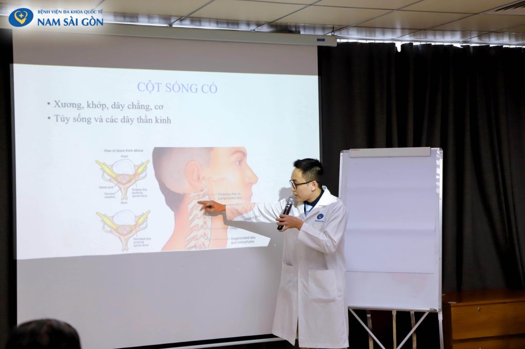 Kết hợp truyền thông giáo dục sức khỏe tại buổi họp hội đồng người bệnh, Ths.BS Dương Đức Anh chia sẻ về dấu hiệu nhận biết bệnh lý thoát vị đĩa đệm cột sống cổ cũng như cách chẩn đoán và điều trị bệnh phù hợp.