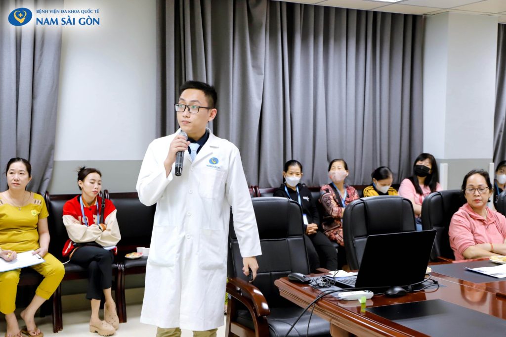 Kết hợp truyền thông giáo dục sức khỏe tại buổi họp hội đồng người bệnh, Ths.BS Dương Đức Anh chia sẻ về dấu hiệu nhận biết bệnh lý thoát vị đĩa đệm cột sống cổ cũng như cách chẩn đoán và điều trị bệnh phù hợp.