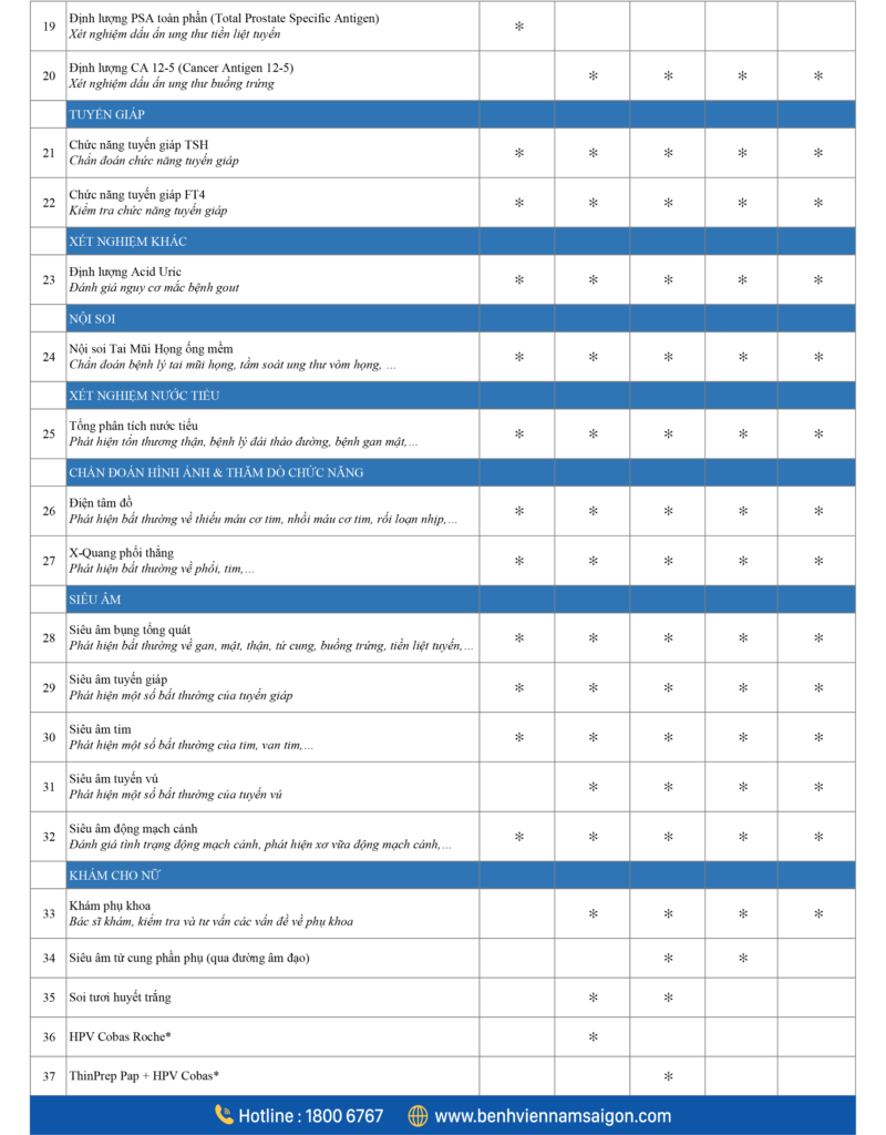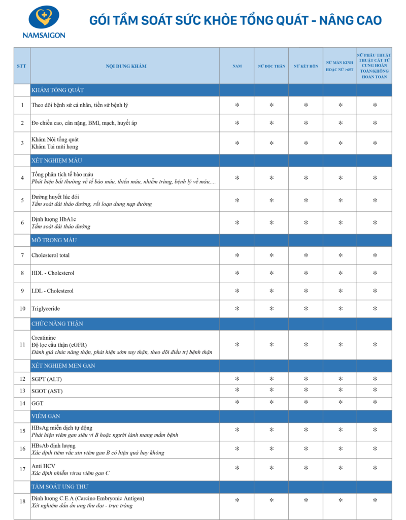 Người trung niên từ 40 tuổi hiện nay đang phải đối mặt với nhiều nguy cơ bệnh lý do lối sống hiện đại, yếu tố di truyền và quá trình lão hoá tự nhiên. Gói khám sức khỏe tổng quát nâng cao tại Bệnh viện Đa khoa Quốc tế Nam Sài Gòn được thiết kế bởi đội ngũ bác sĩ chuyên môn nhằm: