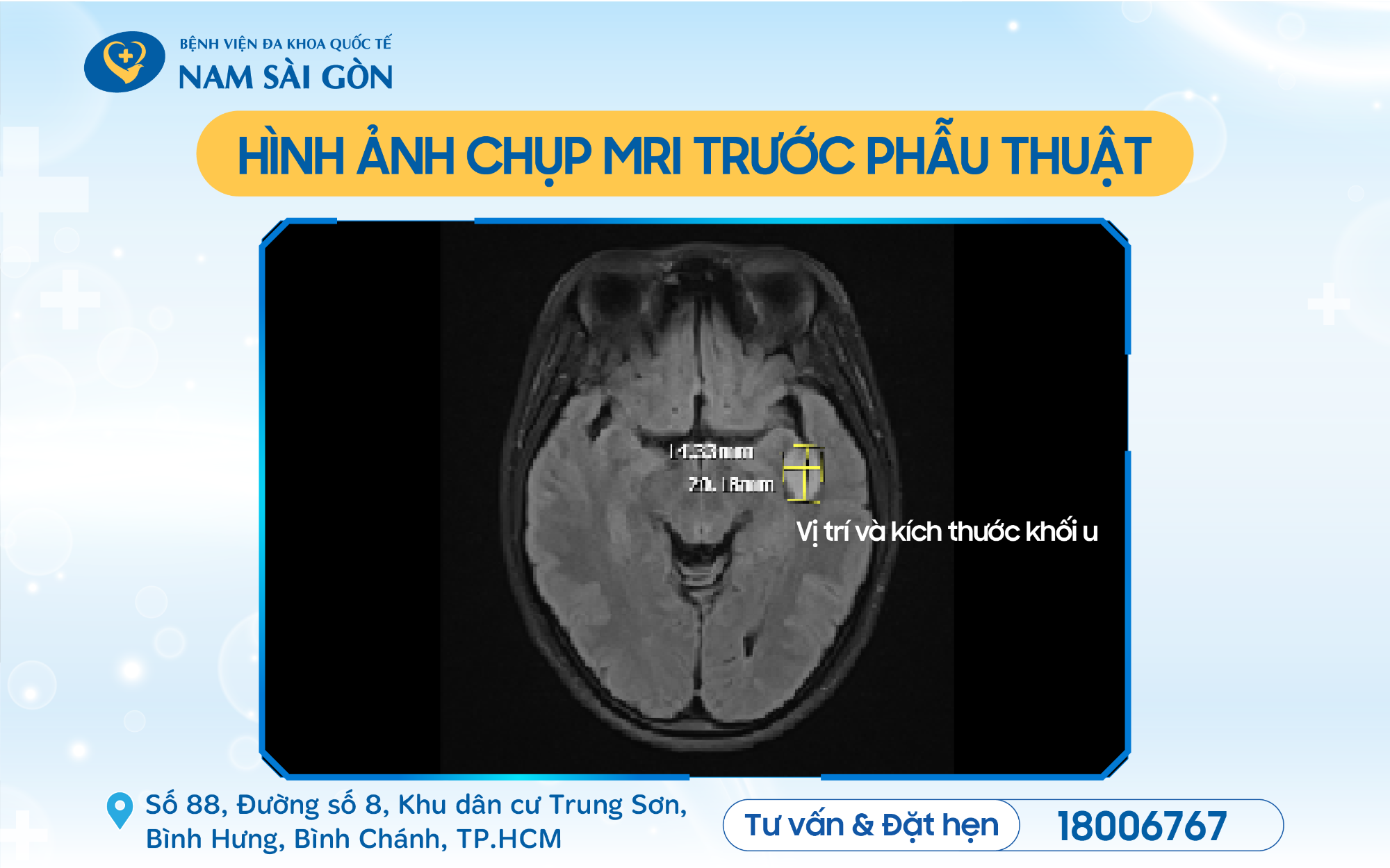 Trong quá trình tìm kiếm phương thức điều trị khác, chị A.N tình cờ biết đến Bệnh viện Đa khoa Quốc tế Nam Sài Gòn, chị và gia đình đã quyết định di chuyển quãng đường hơn 1,500km vào TP.HCM để thăm khám. Tại khoa Ngoại thần kinh – Cột sống, Bệnh viện Đa khoa Quốc tế Nam Sài Gòn, chị A.N đã được bác sĩ chỉ định chụp MRI sọ não có tiêm thuốc tương phản từ, dựng hình 3 mặt cắt, kết quả cho thấy có khối u não ở vùng thái dương trái, khả năng là u sao bào độ thấp, gần vùng ngôn ngữ Wernicke.