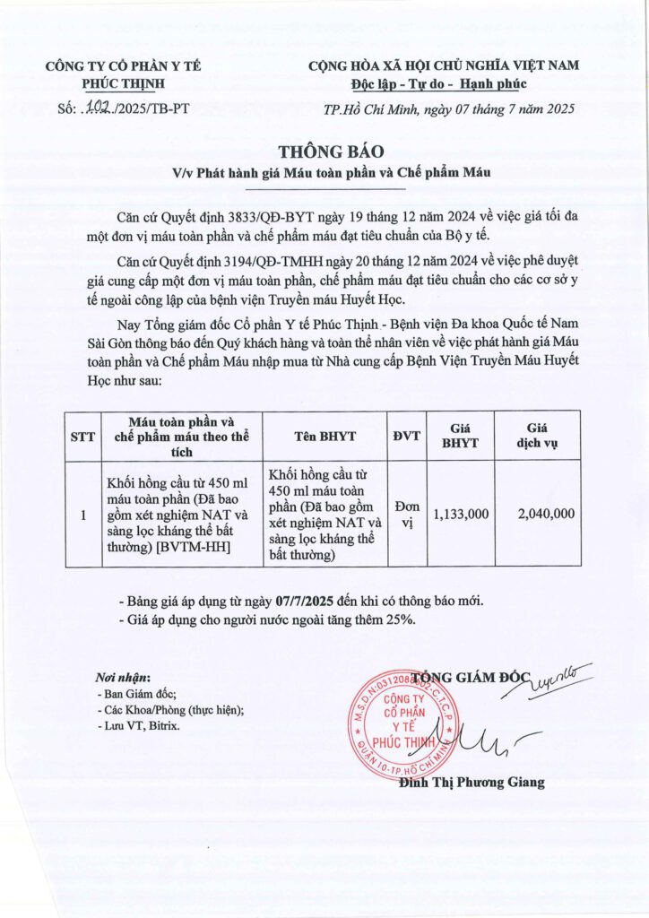 THÔNG BÁO VỀ VIỆC PHÁT HÀNH GIÁ MÁU TOÀN PHẦN VÀ CHẾ PHẨM MÁU TỪ 07-07-2025