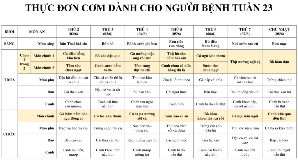 THỰC ĐƠN DÀNH CHO NGƯỜI BỆNH NỘI TRÚ TUẦN 23