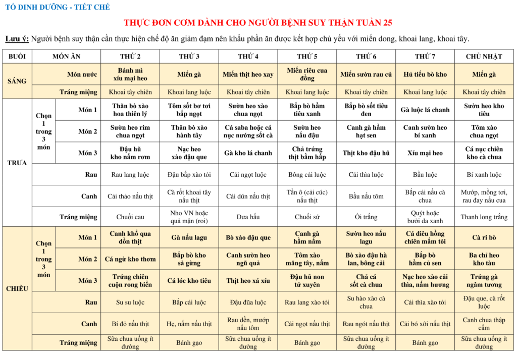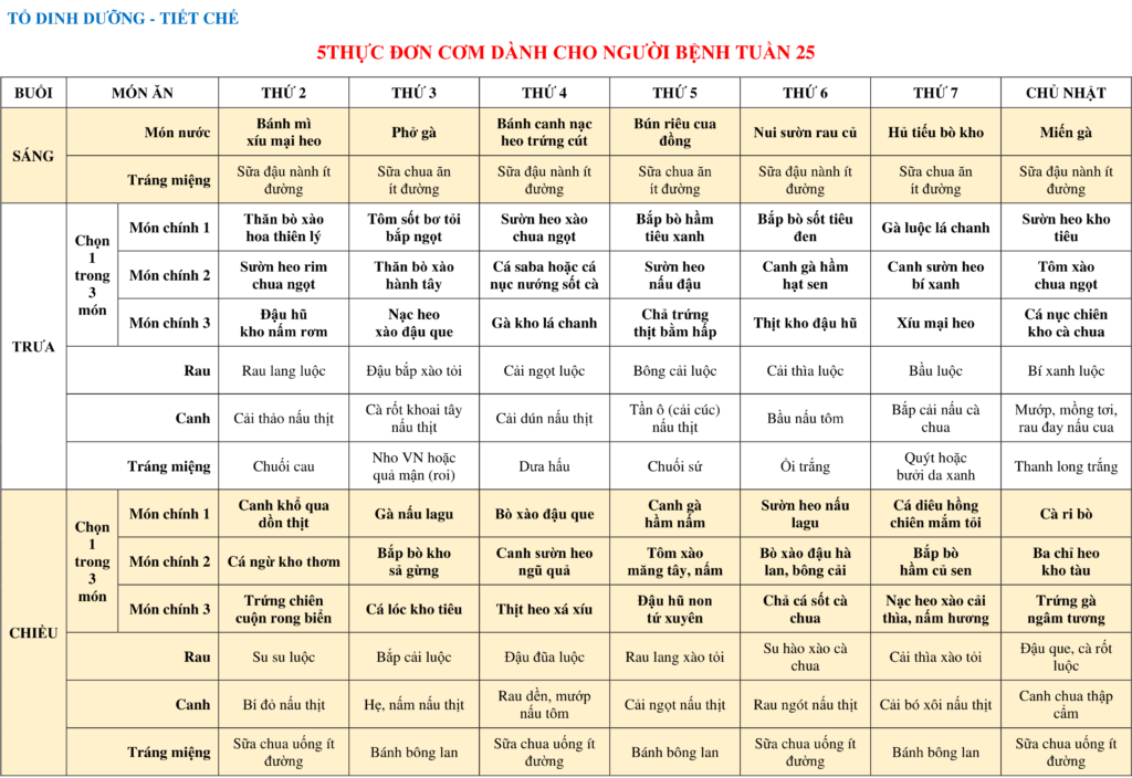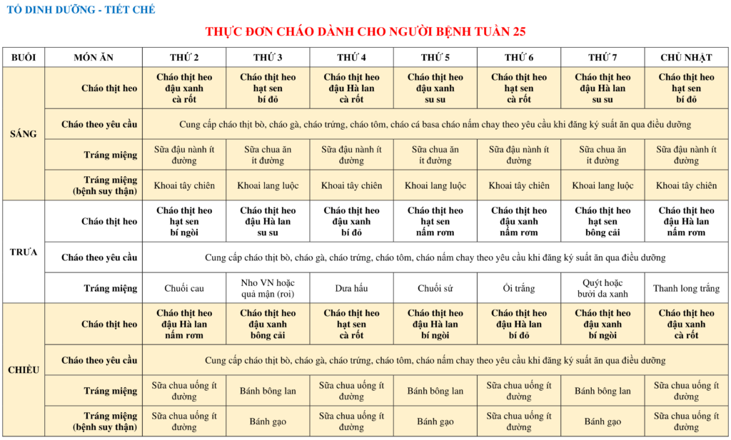THỰC ĐƠN DÀNH CHO NGƯỜI BỆNH NỘI TRÚ TUẦN 25