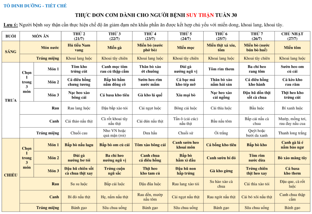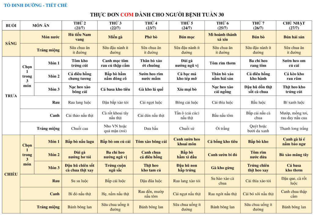 THỰC ĐƠN DÀNH CHO NGƯỜI BỆNH NỘI TRÚ TUẦN 30 (21/7-27/7)