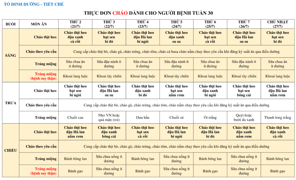 THỰC ĐƠN DÀNH CHO NGƯỜI BỆNH NỘI TRÚ TUẦN 30 (21/7-27/7)