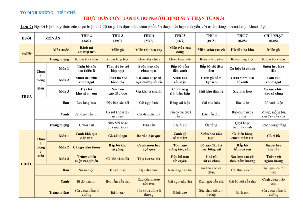 THỰC ĐƠN DÀNH CHO NGƯỜI BỆNH NỘI TRÚ TUẦN 31 (28/7-03/8)