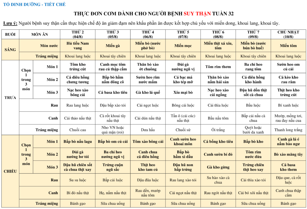THỰC ĐƠN DÀNH CHO NGƯỜI BỆNH NỘI TRÚ TUẦN 32 (04/8-10/8)