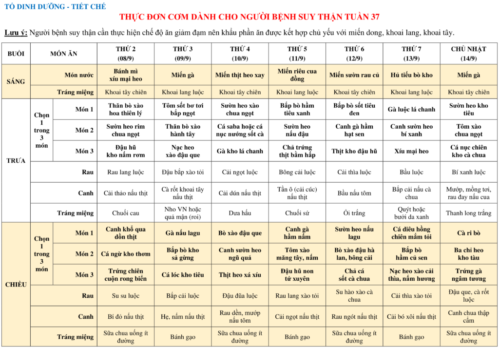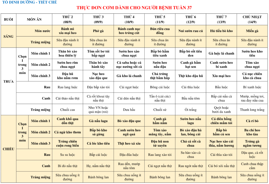 THỰC ĐƠN DÀNH CHO NGƯỜI BỆNH NỘI TRÚ TUẦN 37 (08/9-14/9)