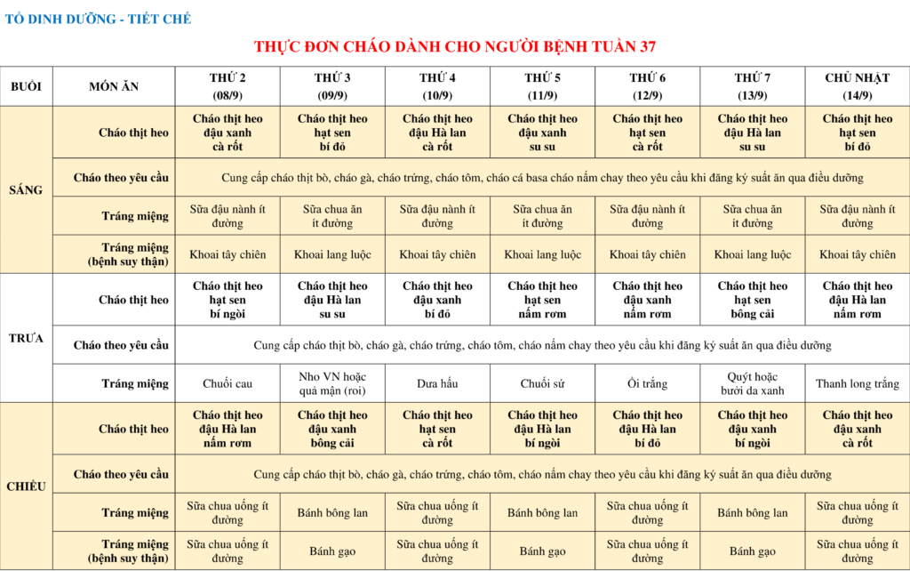 THỰC ĐƠN DÀNH CHO NGƯỜI BỆNH NỘI TRÚ TUẦN 37 (08/9-14/9)