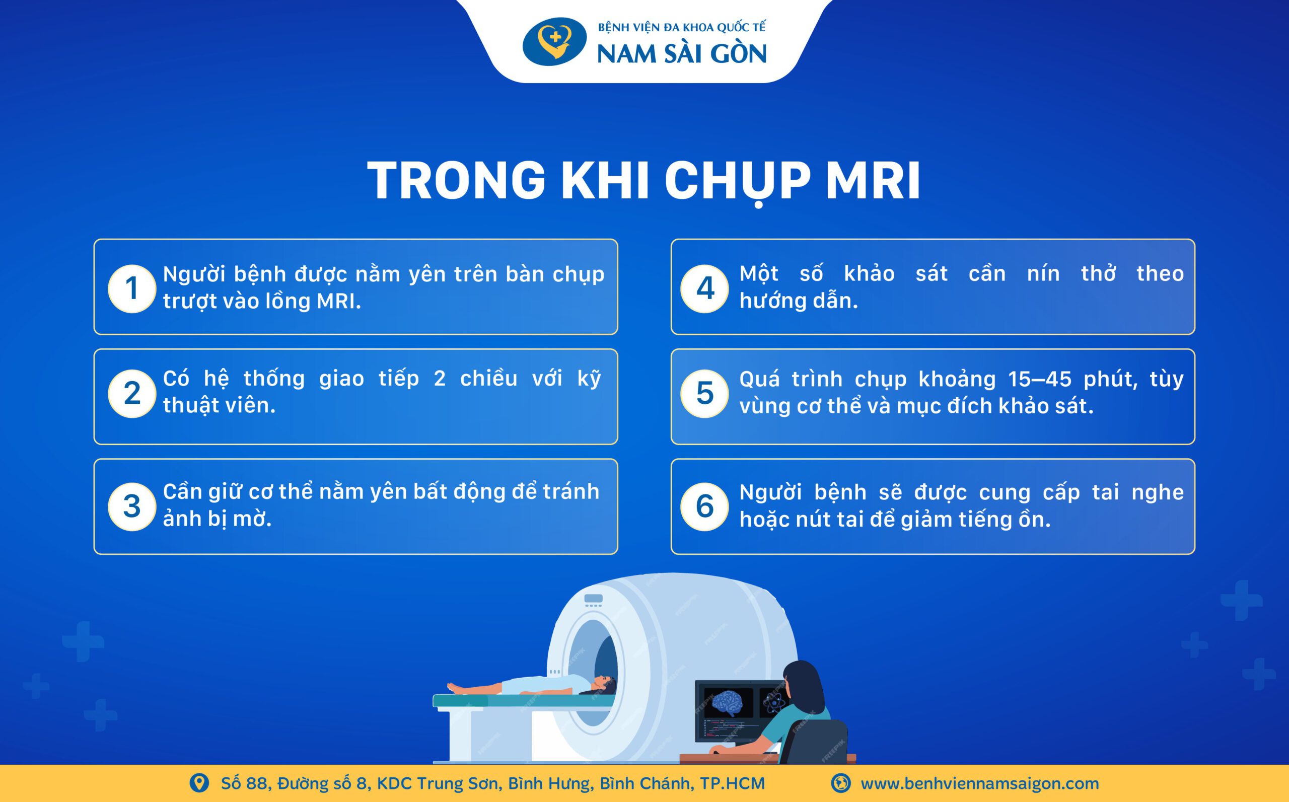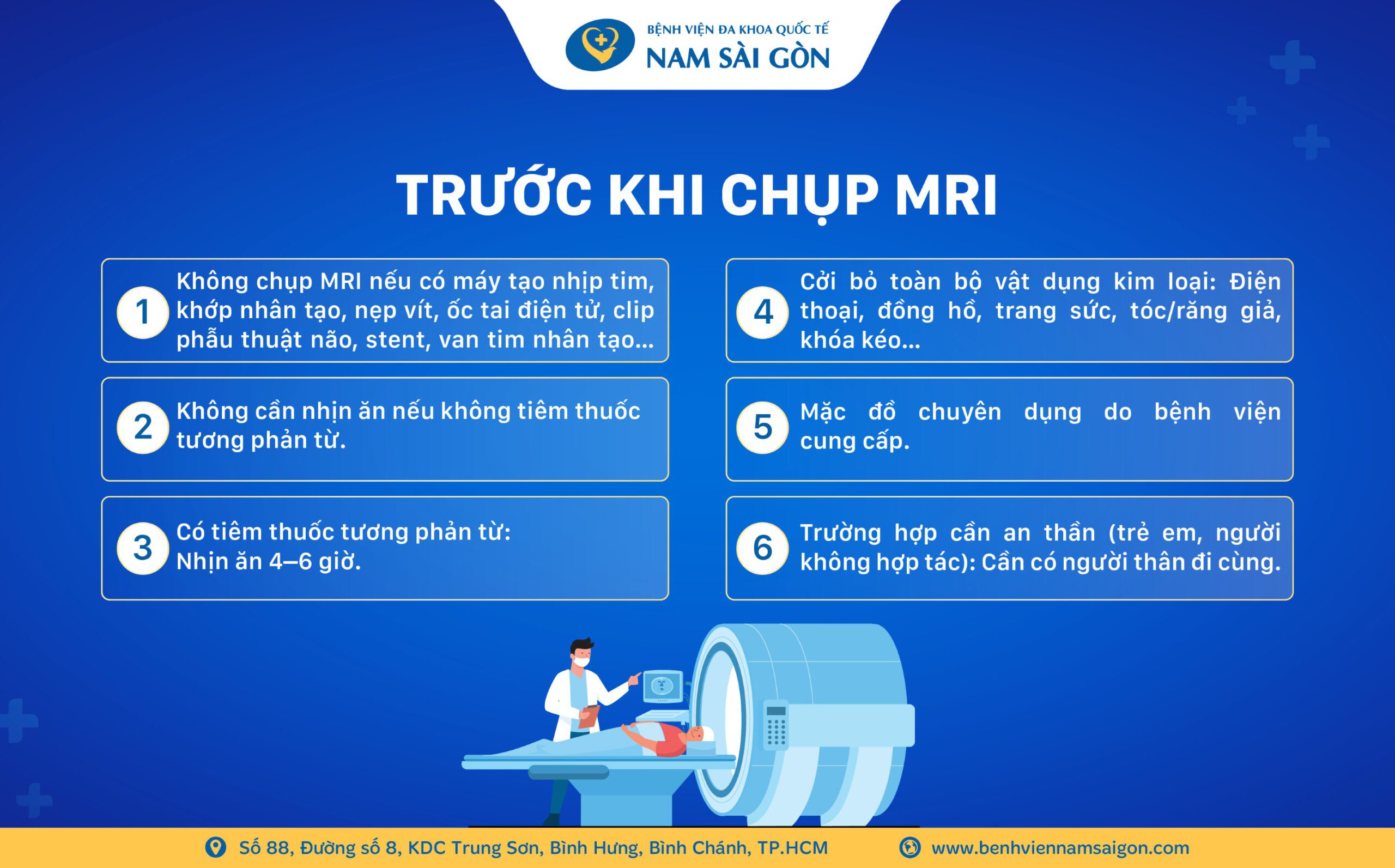 - Người bệnh được kiểm tra tình trạng sức khỏe, làm bảng kiểm MRI để đánh giá độ an toàn. Không chụp MRI nếu có máy tạo nhịp tim, khớp nhân tạo, nẹp vít, ốc tai điện tử, clip phẫu thuật não, stent, van tim nhân tạo…)