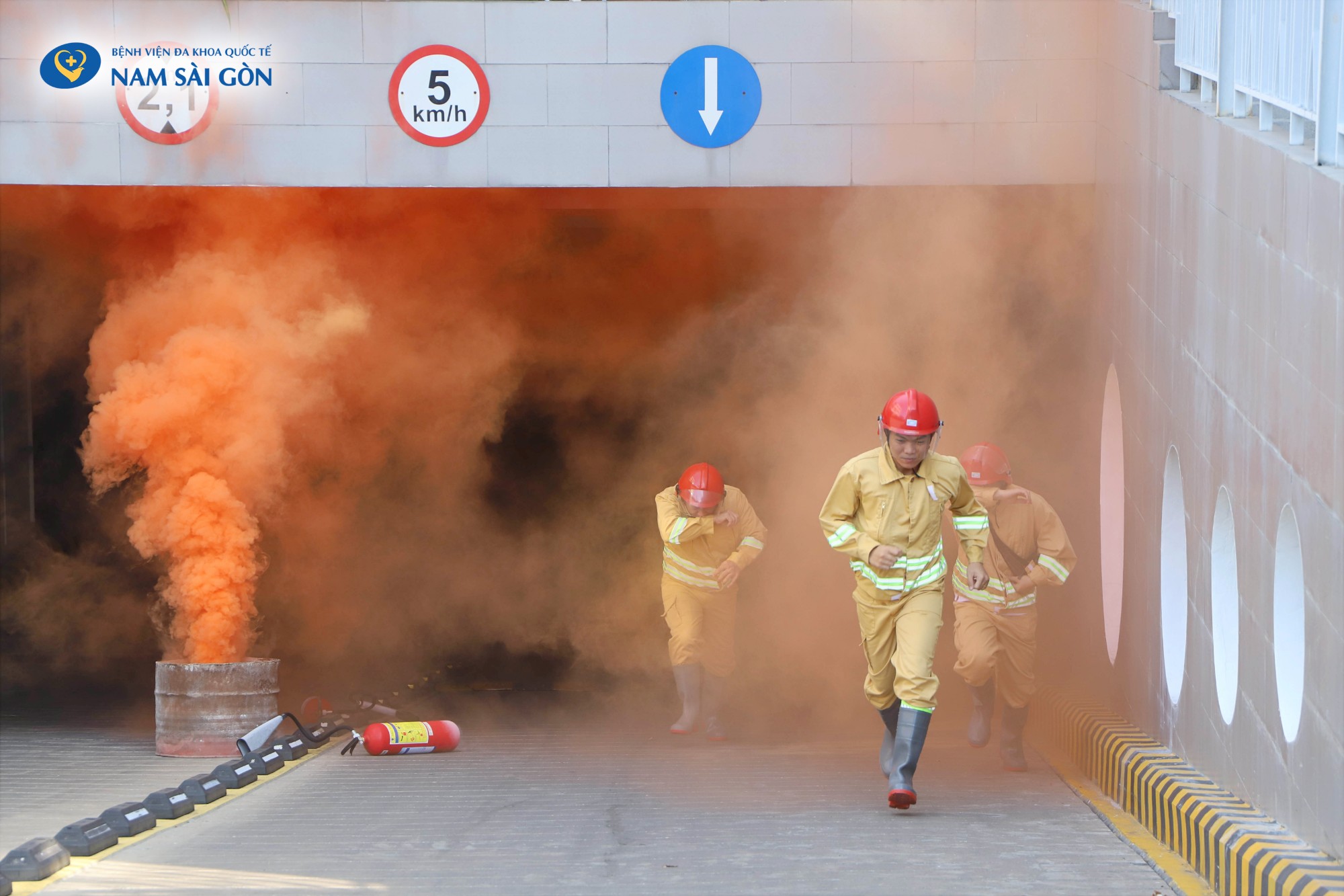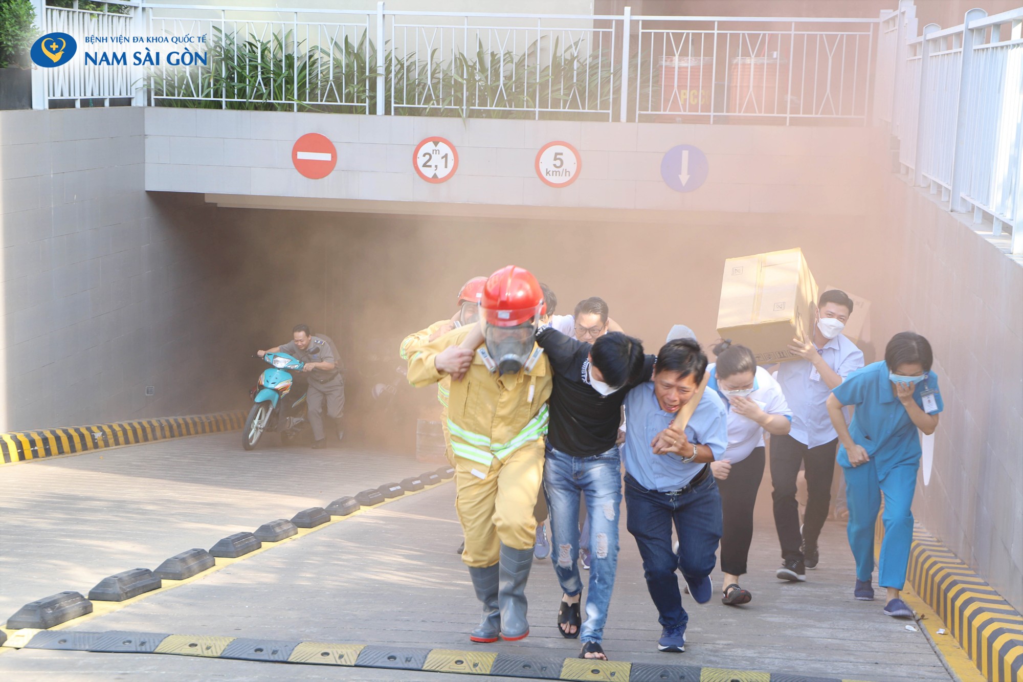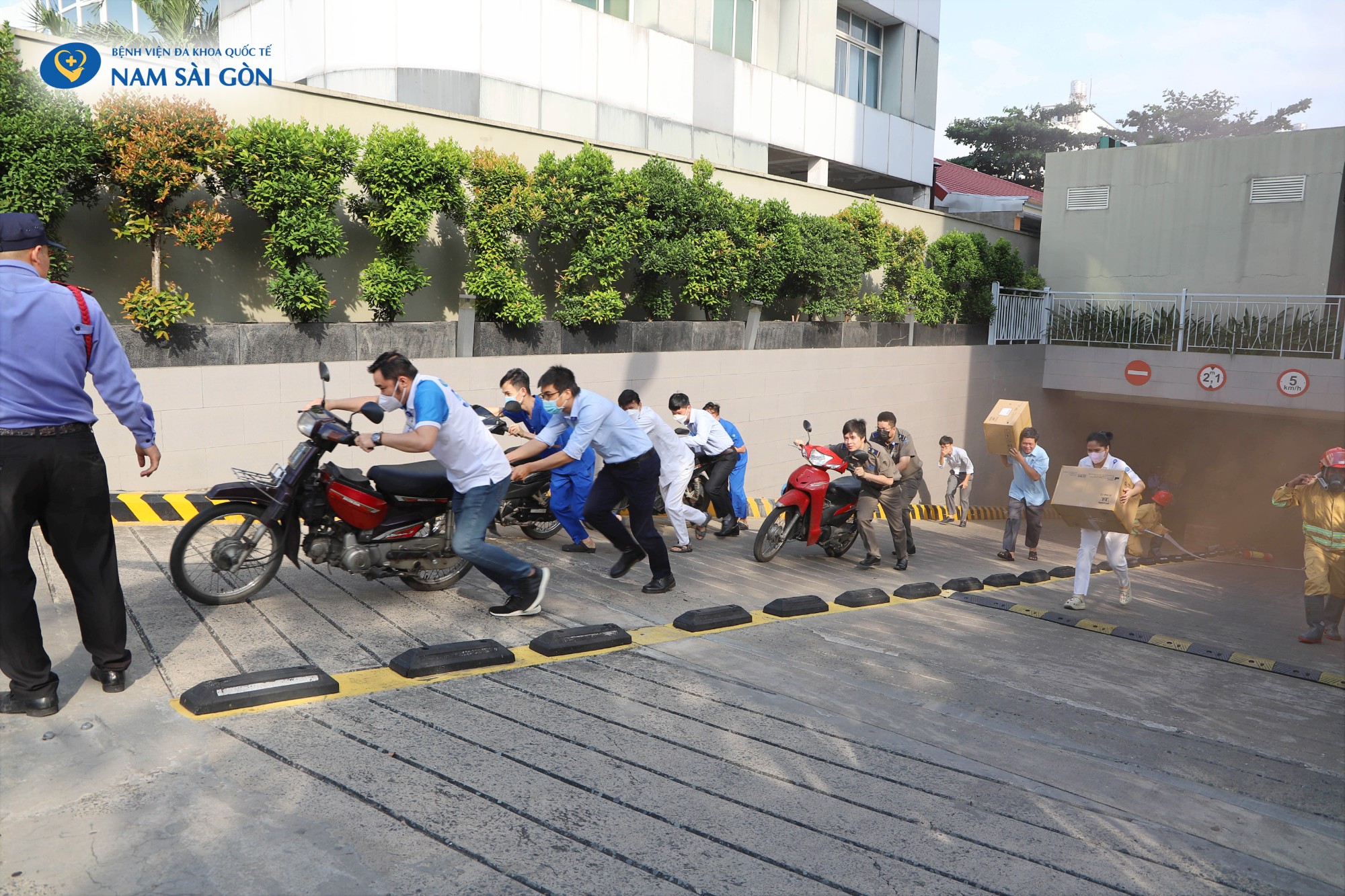 Buổi diễn tập diễn ra với tình huống giả định là chập hệ thống điện của bình xe máy gây cháy nổ tại khu vực để xe hầm B2. Ngay lập tức, người phát hiện đám cháy thông báo cho mọi người trong khu vực sơ tán khẩn cấp & gọi Lực lượng phòng cháy chữa cháy, cứu nạn cứu hộ và cơ quan chức năng. Đội Phòng cháy chữa cháy của Bệnh viện phối hợp cùng cơ quan chức năng nhanh chóng triển khai đội hình, tiến hành chữa cháy, cứu người và tài sản bị mắc kẹt trong đám cháy ra khu vực an toàn.