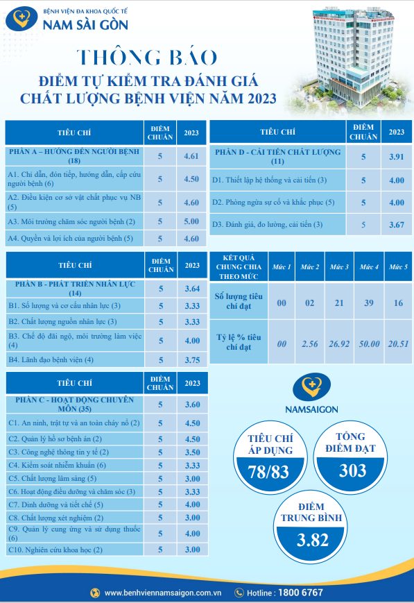 Kết quả tự kiểm tra đánh giá chất lượng Bệnh viện Đa khoa Quốc tế Nam Sài Gòn năm 2023