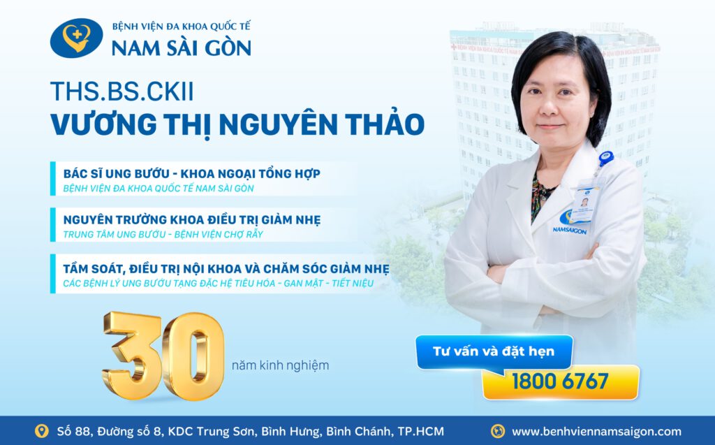 ThS.BS.CKII Vương Thị Nguyên Thảo – bác sĩ chuyên gia Ung bướu – Bệnh viện Đa khoa Quốc tế Nam Sài Gòn với hơn 30 năm kinh nghiệm trong lĩnh vực điều trị nội khoa Ung bướu và chăm sóc giảm nhẹ.
