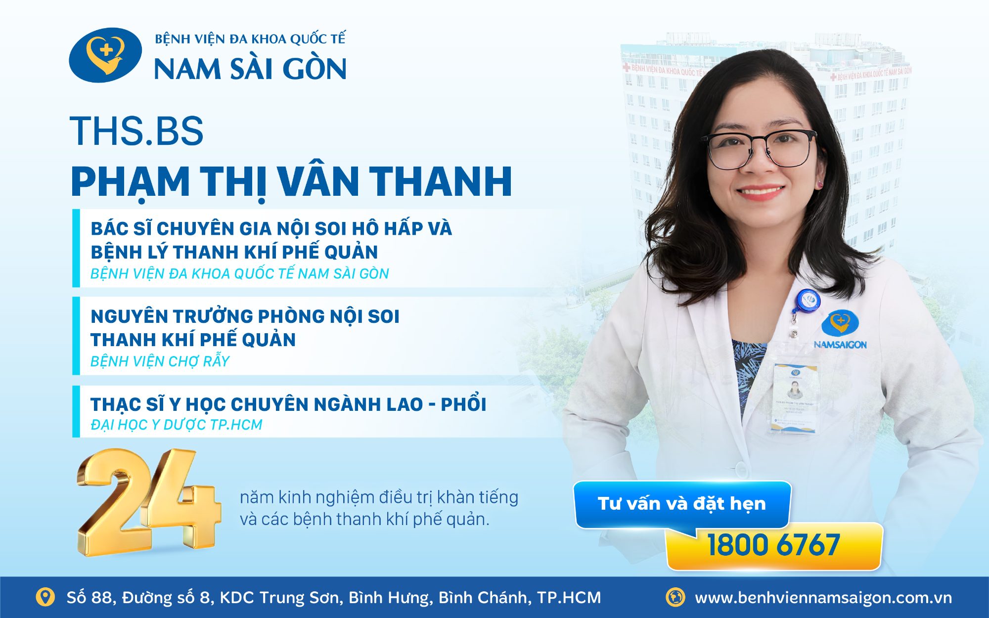 ThS.BS Phạm Thị Vân Thanh là bác sĩ có bề dày kinh nghiệm hơn 24 năm trong lĩnh vực nội soi hô hấp tại Bệnh viện Chợ Rẫy, từng tu nghiệp chuyên ngành Nội soi thanh – khí – phế quản tại Đại học California, Irvine, Hoa Kỳ.